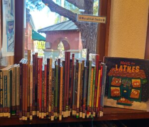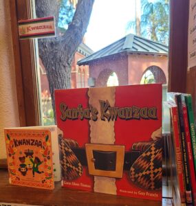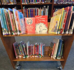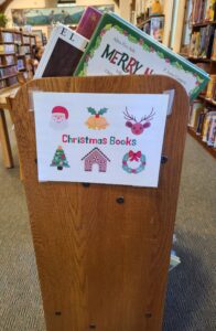 The holiday book display can be found on the windowsills near the 900-book section as well as on a book cart nearby. We have Christmas, Hanukkah and Kwanzaa books available to check out. French, Spanish, and English language books adorn the cart with holiday magic.